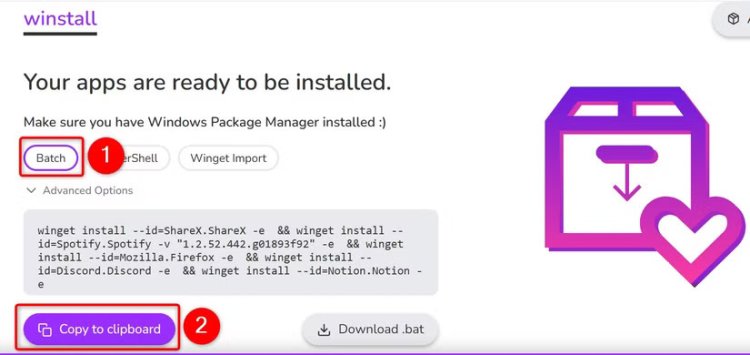 Pada halaman berikutnya, di atas kotak teks, pilih "Batch." Lalu, di bawah kotak, klik "Copy to Clipboard." Ini menyalin perintah yang menginstal aplikasi pilihan Anda.