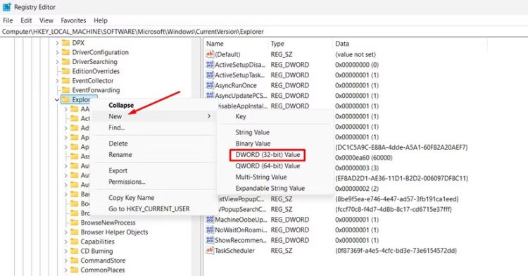 Klik kanan tombol "Explorer" di bilah sisi kiri, klik "New", lalu pilih "Nilai DWORD (32-bit)".