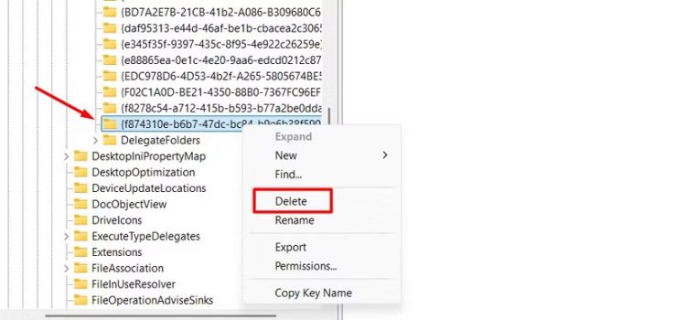Cari dan klik kanan tombol kunci nama"{f874310e-b6b7-47dc-bc84-b9e6b38f5903}" di bilah sisi kiri dan pilih "Delete" dari menu yang muncul. Klik "Ya" untuk mengonfirmasi keputusan Anda.