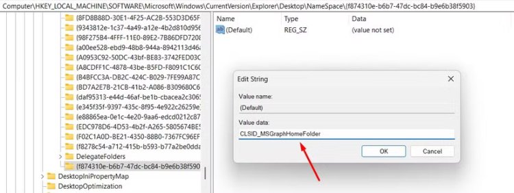 Beri nama kunci {f874310e-b6b7-47dc-bc84-b9e6b38f5903} . Kemudian, klik dua kali pada string "Default" kunci di sebelah kanan, ketik CLSID_MSGraphHomeFolder di kolom Data nilai, dan klik "OK."